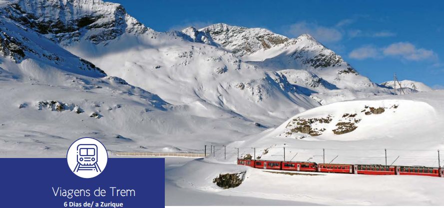 Zurique (sem hospedagem), Chur, Bernina Express: Chur/Tirano/Chur , Glacier Express: Chur/Brig/Interlaken, Trem Jungfrau, Interlaken, Zurique (sem hospedagem)